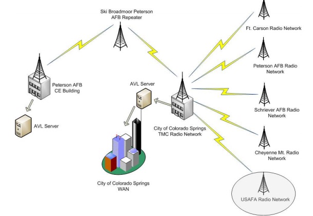 AVL tracking data was made available as a web service and stored in and AVL data server for further processing and integration with research applications. As previously mentioned, the USAFA AVL project was a subset of the overall Colorado Springs Automated Vehicle Location system that was designed to address emergency response and preparedness. The configuration of the overall 8 network was centrally located at the CSTMC because it is one of the primary hubs for fiber communication in the city (FIGURE 1). The layout and configuration of data transmission was designed so that the data would be collected on an MS SQL server and then further distributed to other locations such as Peterson AFB and USAFA (FIGURE 2).