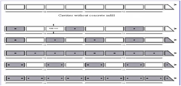 After inserting vertical reinforcement rods as per the structural design and clamps for wall corners are in place to keep the wall panels in perfect position, concrete of 12mm size aggregate will be poured from top into the cavities. There is no need to use vibrator because gravitational pressure acts to self compact the concrete inside the water tight cavities. Generally every third cavity should be concreted.
