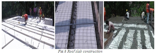 Instead of a solid concrete floor slab, which is typically 100 to 150mm thick, the GFRG panels are used. They are placed horizontally over the walls in different roofs. The roofs typically spanning along the shorter direction. Concrete tie beams connect the panels to the walls at all junctions. Every third cavity in the horizontal GFRG panel is cut open from the top and reinforced cage is inserted to serve as a concealed beam. Further a steel welded mesh is placed on top of the entire floor slab and subsequently embedded in screed of concrete 50mm thick. The advantage with the system over conventional concrete slabs is the there is no need of shuttering and the finish at bottom is excellent. It also not required any plastering. Conduits for electrical work are kept in place before concreting the slab.