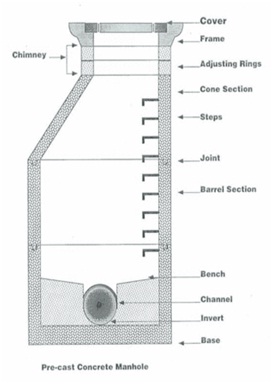 A manhole is an opening constructed on the alignment of sewer for facilating a person access to the sewer for the purpose of inspection, testing, cleaning & removal of obstruction from the sewer line.