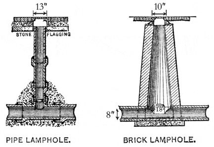 The lamphole consist of vertical stoneware or concrete pipes which are connected to the sewer line through a tee junction. The pipes are surrounded by concrete make them stable. At the ground level, the manhole cover with frame is provided to take up the load of traffic.