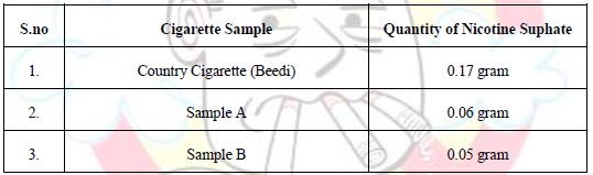 The analysis showed relatively higher levels of nicotine in tobacco from beedis (0.17g) as compared to cigarettes (0.05g in Sample B and 0.06g in Sample A)