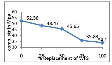 2. The compressive strength at 50% replacement by waste foundry sand gives the target strength as per the mix design conforming to IS 10262-2009. Hence 50% replacement is taken as the optimum percentage replacement.
