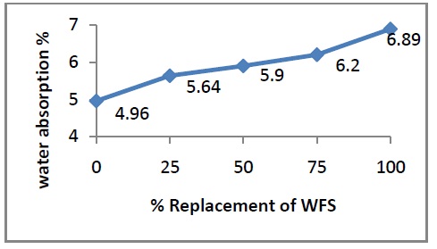The water absorption in % increases as the percentage replacement by foundry sand increases. The water absorption should be restricted to 6%.
