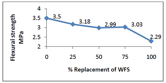The flexural strength decreases upto 50% replacement by waste foundry sand. The minimum breaking load for residential pathway and pedestrian paths is 2 kN as per IS: 15658-2006 which is satisfied.