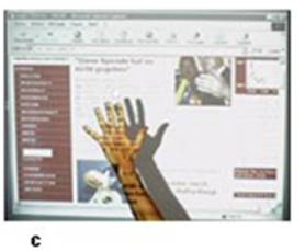 Figure: The FingerMouse on a projected screen (a) Moving the mouse pointer (b) Double-clicking with an outstretched thumb (c) Scrolling up and down with all five fingers outstretched