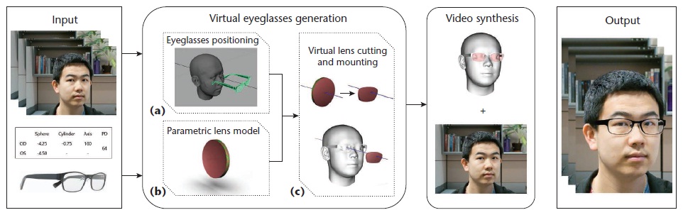 The virtual try-on system we developed inserts prescription eyeglasses onto the user’s face and simulates important changes to the appearance due to refraction, reflection, or shadows cast on the face. The system uses the following three elements as input: