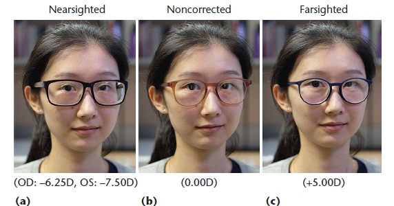 Vision-correcting eyeglasses have improved the lives of millions of people. Eyeglasses significantly affect the wearer’s appearance, and the selection of new pairs of eyeglasses is largely based on how the glasses look when wearers try them on. However, an often overlooked fact is that corrective lenses introduce distortion caused by the refraction effect. As Figure 1 illustrates, the eyes of a person wearing corrective lenses for nearsightedness appear smaller compared with wearing nonprescription lenses, whereas the eyes of a person wearing lenses for farsightedness appear larger. The traditional process of trying on and picking new eyeglasses frames in a brick-andmortar shop has a significant shortcoming: eyeglasses on the display are equipped with demo lenses that have zero corrective power, and thus refraction does not deform the eyes.