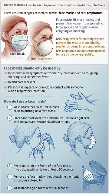 Wearing a medical mask is one of the prevention measures to limit spread of certain respiratory diseases, including COVID-19, in affected areas. However, the use of a mask alone is insufficient to provide an adequate level of protection and other equally relevant measures should be adopted.