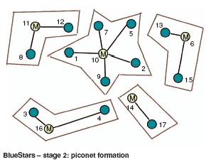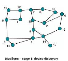 BlueStars produces a mesh-like connected scatternet with multiple routes between pairs of nodes. It is a distributed solution. That is, all the nodes participate in the formation of the scatternet. But they do so with minimal, local topology knowledge (nodes only know about their one-hop neighbors). BlueStars, a new scatternet formation protocol for multi-hop Bluetooth networks, that overcomes the drawbacks of previous solutions in that it is fully distributed, does not require each node to be in the transmission range of each other node and generates a scatternet whose topology is a mesh.