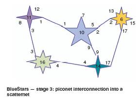 3. The final phase concerns the selection of gateway devices to connect multiple BlueStars. The purpose of the third phase of our protocol is to interconnect neighboring BlueStars by selecting inter-piconet gateway devices so that the resulting scatternet is connected whenever physically possible. The main task accomplished by this phase of the protocol is gateway selection and interconnection.