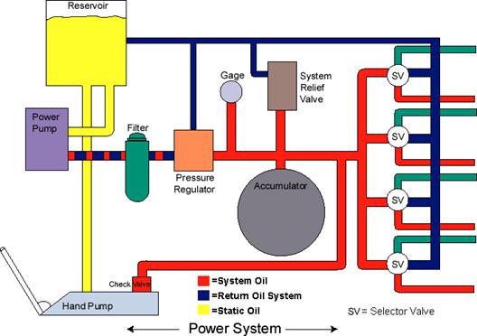 It is a system where liquid under pressure is used to transmit this energy. Hydraulic systems take engine power and convert it to hydraulic power by means of a hydraulic pump. This power can be distributed throughout the airplane by means of tubing that runs through the aircraft. Hydraulic power may be reconverted to mechanical power by means of an actuating cylinder, or turbine.