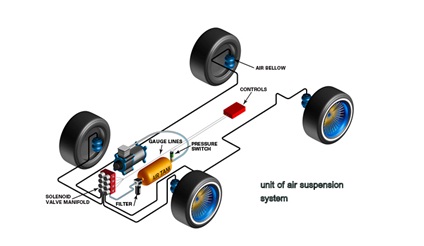 An air suspension supports the vehicle on the axles with an arrangement of air bags instead of some type of steel spring, leaf or coil, or some type of torsion spring arrangement. The air bags are sometimes referred to as air springs or bellows. Suspensions that have steel or torsion springs that are supplemented by the use of air bags are not considered air suspensions. There are combination systems that have both air and steel springs. Usually the air suspension components are used on the rear of the vehicle.