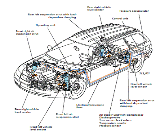 The air suspension system is an air-operated, microprocessor controlled suspension system. This system replaces the conventional coil spring suspension and provides automatic front and rear load leveling. The 4 air springs, made of rubber and plastic, support the vehicle load at the front and rear wheels'.