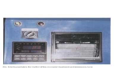 The older cryogenic tanks did not have adequate controls. A relatively new cryogenic system (model 2953, lead illustration) achieves consistent results. The new cryogenic machines operate with controlled dry thermal treatment. "Controlled" simply means that the process is performed according to a precise prescribed time table. A process controller (Yokogawa UP 25) operates the descent; soak and ascent modes (see Fig. 5). Generally, the material is cooled slowly to -317°F, held for 20-60 hr then raised to +300°F, and slowly returned to room temperature.