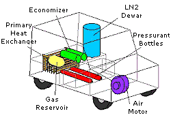 The principle of running the LN2000Car is like that of steam engine, except there is no combustion involved. Instead liquid nitrogen at -320 o F (-196 o C) is pressurized and then vaporized in a heat exchanger by ambient temperature of the surroundings air. This heat exchanger is like the radiator of a car but instead of using air to cool water, it uses air to heat and boil liquid nitrogen. The resulting high pressure nitrogen gas is fed to an engine that operates like a reciprocating steam engine, converting pressure to mechanical power. The only exhaust is nitrogen, which is major constituent of our atmosphere.