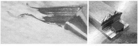 • Ductility-the machining of ductile alloys requires very sharp cutting edges with a positive rake angle. For the operation to be a cutting process rather than a plowing action. However, these materials must be machined with strong tools with low rake angles because of their high specific cutting energy. The high ductility is responsible of the some frequent chip type named ``chipfoot,'' when the tool exits from the work piece; at this point the material is stretched rather than cut. This produces an uncontrolled chipping of the tool edge. Figure below shows an Inconel chip-foot and the burrs on the edges of a Haynes 25 work piece that also related with material ductility