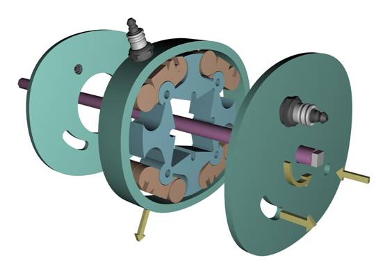 Intake, spark plug and exhaust ports are made either radially in the housing, or axial in the side covers, or both. In order to pass along the flame make a continuous combustion engine, a small channel(ignition flame transfer slot) located along the internal housing counter wall next to spark plug allows a voluntary flow back of hot gases into the next ready-to-fire combustion chamber. Screwing or unscrewing the spark plug can control the amount of flow. This channel is called ignition transfer cavity.