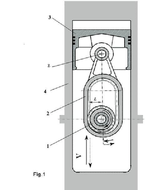 The arrangement of the engine is shown in figure-1. The running gearing is made up of toothed gear 1 seated on the engine shaft and being in constant mesh with gear frame 2. Gear frame 2 is shaped consisting of two racks of equal length and two toothed semicircles of equal radii. By this alternative the gear frame is connected to piston 3 of cylinder block 5 via a motion unit of Z axis.
