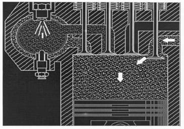 The combustion chambers walls are glowing when the engine is running. Their small thickness allows heat exchange with the air-heating chamber, which is surrounding the combustion chamber. The air-heating chamber is isolated from the cylinder head to reduce thermal loss.