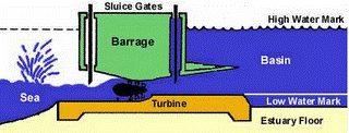 The second component of a tidal power generation plant is the tidal barrage. This barrage looks like a wall that cuts off the estuary from the remainder of the sea. The bottom of the barrage sits on the sea floor, and the top of the barrage sits above the highest level that seawater can reach at high tide (Edinger 2000). The tidal barrage serves the purpose of cutting off seawater from water in the estuary so that water can be channeled through the wall in a beneficial manner for tidal power to be created.