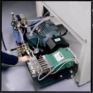 The direct drive pump operates in the same manner as a low-pressure "pressure washer" that you may have used to pressure wash a house or deck prior to repainting. It is a triplex pump that gets the movement of the three plungers directly from the electric motor. These pumps are gaining acceptance in the Waterjet industry due to their simplicity. At the time of this writing, direct drive pumps can deliver a maximum continuous operating pressure 10 to 25% lower than intensifier pumps units (20k to 50k for direct drive, 40k to 60k for intensifiers).