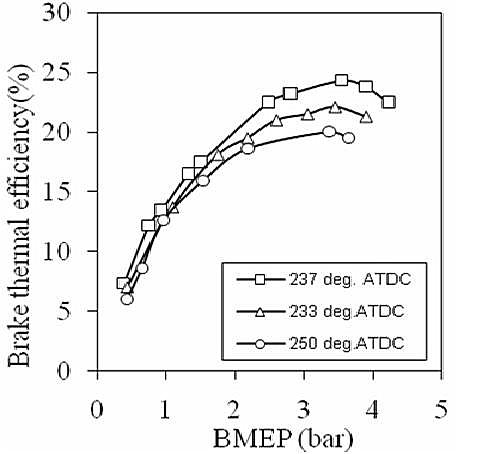 Any further increase in the injection advance angle of 2330 results in reduction in maximum brake thermal efficiency is 22.1% at BMEP of 3.45 bar. This is due to the fact that the exhaust gases may carry a small fraction of injected fuel while scavenging.