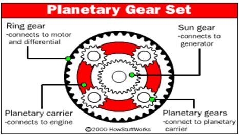 The generator is connected to the sun gear of the gear set, and the engine is connected to the planet carrier. The speed of the ring gear depends on all three components, so they all have to work together at all times to control the output speed.