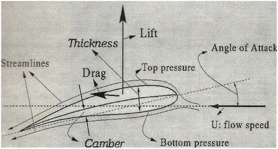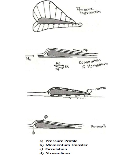 As the speed along these streamlines increases, the pressure drops (this will become important shortly). The fluid that moves over the upper surface of the foil moves faster than the fluid on the bottom. This is due in part to viscous effects, which lead to formation of vertices at the end of the foil. In order to conserve angular momentum caused by the counter-clockwise rotation of the vortices, there has to be an equal but opposite momentum exchange to the vortex at the trailing edge of the foil. This leads to circulation of the fluid around the foil. The vector summation of the velocities results on a higher speed on the top surface and a lower speed on the bottom surface. Applying this to Bernoulli's it is observed that, as the foil cuts through fluid, the change in velocity produces the pressure drop needed for the lift. As it is presented in the diagram, the resulting or net force (force= i pressure) (area)) is upward.