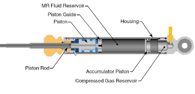 A monotube MR damper is one that has only one reservoir for the MR fluid and also has some way to allow for the change in volume that results from piston rod movement. In order to accommodate this change in reservoir volume, an accumulator piston is usually used. The accumulator piston provides a barrier between the MR fluid and a compressed gas (usually nitrogen) that is used to accommodate the necessary volume changes.