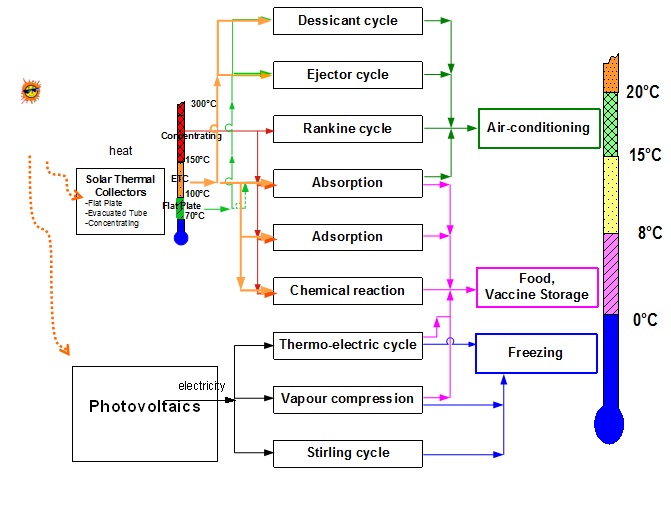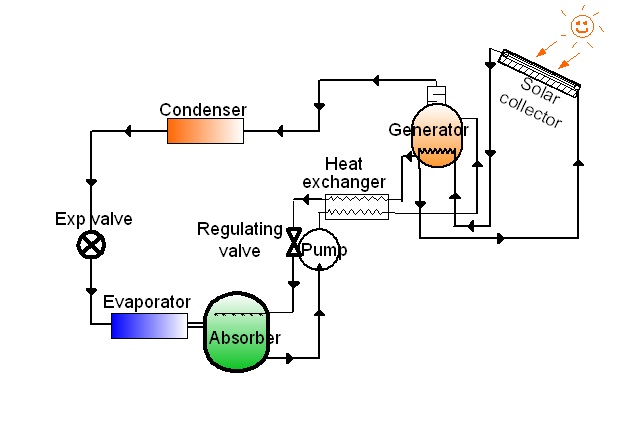 Adsorption refrigeration and heat pump cycles rely on the adsorption of a refrigerant gas into an adsorbent at low pressure and subsequent desorption by heating. The adsorbent acts as a "chemical compressor" driven by heat and is, from this point of view, the "pump" of the system. It consists of a solar collector, a condenser or heat-exchanger and an evaporator that is placed in a refrigerator box. The inside of the collector is lined with an adsorption bed packed with activated carbon adsorbed with methanol. The refrigerator box is insulated filled with water. The activated carbon can adsorb a large amount of methanol vapours in ambient temperature and desorb it at a higher temperature (around 100 degrees Celsius). During the daytime, the sunshine irradiates the collector, so the collector is heated up and the methanol is desorbed from the activated carbon. In desorption, the liquid methanol adsorbed in the charcoal heats up and vaporizes. The methanol vapour condenses and is stored in the evaporator.