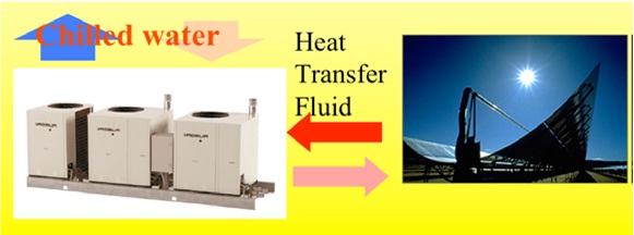 The core idea is to use the solar energy directly to produce chilled water. The high temperature required by absorption chillers is provided by solar troughs. The system doesn’t require “strategic” materials (like in PV systems) and has peak production in the moment of peak demand.