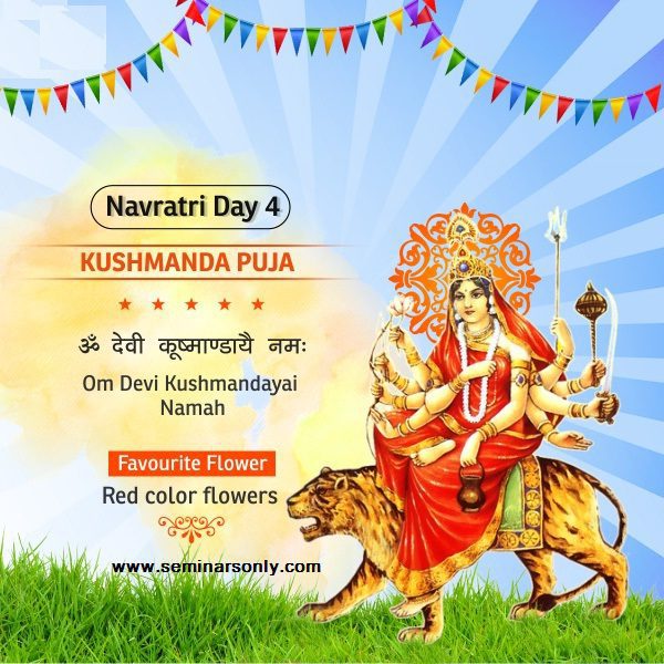 Goddess Kushmanda is worshiped on Chaturthi. Believed to be the creative power of the universe, Kushmanda associated with the endowment of vegetation on earth and hence, the color of the day is Orange. She is depicted as having eight arms and sits on a Tiger.