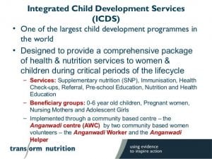 Child development Integrated Child Development Scheme or Integrated Child Development Scheme (ICDS in short) Integrated package of nutritional and educational services to children up to the age of 6, health to pregnant women and lactating women, severely malnourished children and adolescents