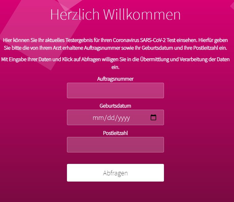Hier können Sie Ihr aktuelles Testergebnis für Ihren Coronavirus SARS-CoV-2 Test einsehen. Hierfür geben Sie bitte die von Ihrem Arzt erhaltene Auftragsnummer sowie Ihr Geburtsdatum und Ihre Postleitzahl ein.