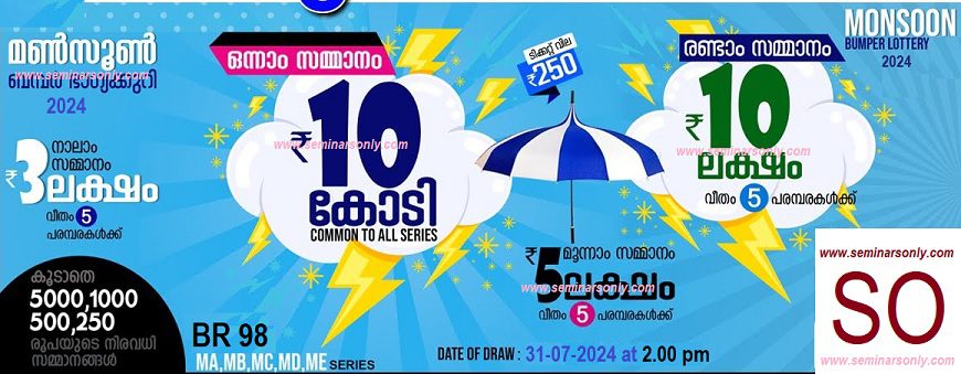 Kerala Monsoon Bumper 2024 BR 98 on 31.7.24 Lottery Jackpot Draw Date and Results