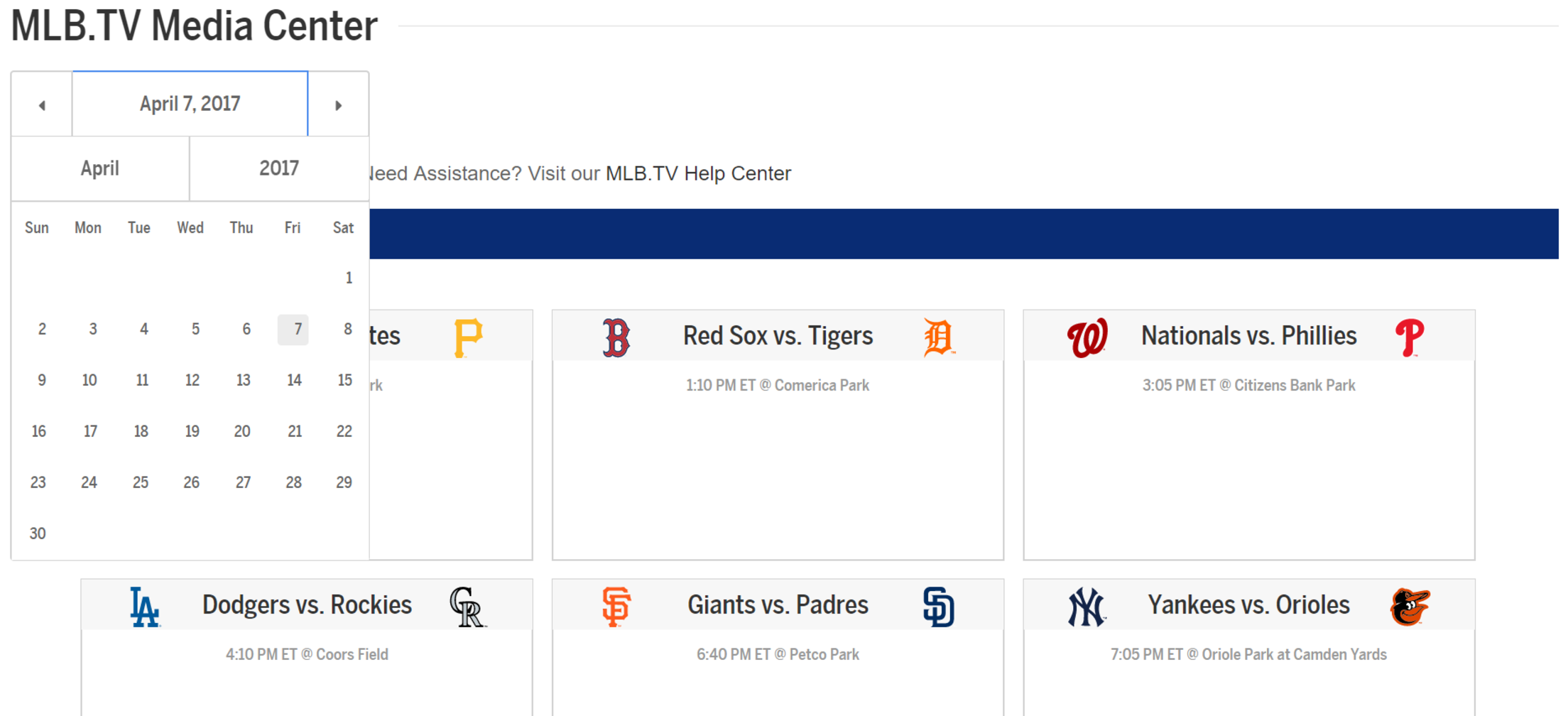 - From the MLB.com Media Center menu select a game to view. Navigate to dates by clicking the date header and using the pop-up calendar.