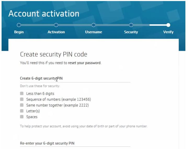 10. Finally we need you to Create a 6-digit security PIN. You’ll need this in the future if you have to reset your password. Your PIN must meet our security strength criteria. As you type your PIN each criteria will be coloured green to confirm you’ve met it. If it’s not been met, it will show as red. We then ask you to Re-enter your 6- digit security PIN. Select Next to continue.