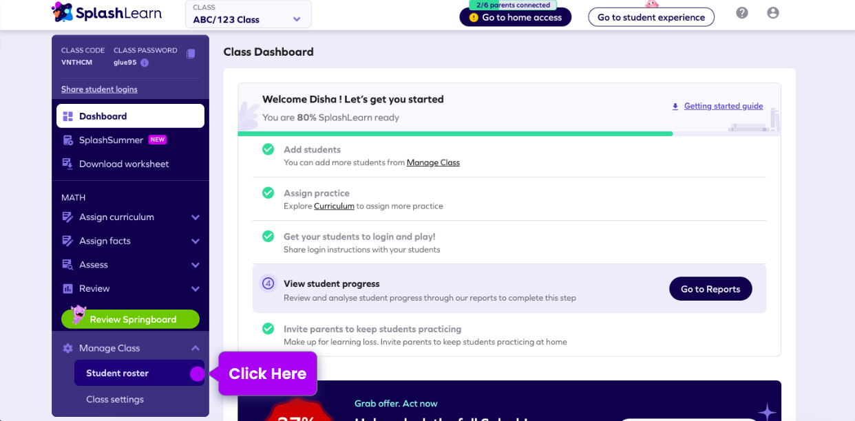 Providing students with the Class Code simplifies the login process, saving time and effort for both you and your students. This efficient system ensures that students can seamlessly access their SplashLearn accounts, engage with assignments, and enjoy interactive learning activities.