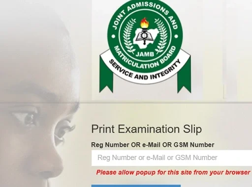 To print your JAMB 2025 UTME Examination Slip, Go to the JAMB Examination Slip Printing Portal. Provide your JAMB Registration Number, Email Address, or GSM Number in the designated field.
