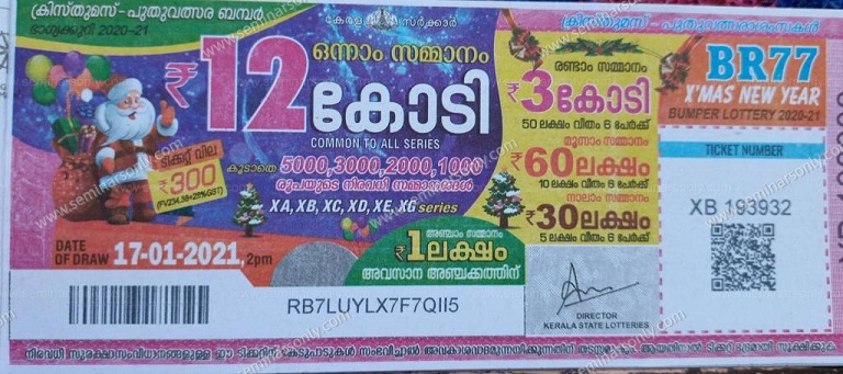 LIVE : 17.01.21 Christmas New Year Bumper 2021 BR 77 Kerala Jackpot Lottery Results - 12 Crores First Prize Rs.300 per ticket : ക്രിസ്തുമസ് പുതുവത്സര ബമ്പർ ബി ആർ 77 തത്സമയ ഭാഗ്യക്കുറി ഫലം: Kerala State Lotteries: The first prize is worth whopping Rs 12 Crores, while the second prize is Rs.50 Lakhs and third prize is Rs.10 Lakhs. Christmas New Year Bumper 2021 BR 77 Draw to be held on 17/01/2021 at Gorky Bhavan Near Bakery Junction Thiruvananthapuram.