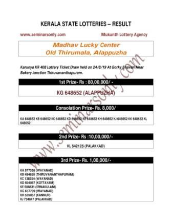 Kerala Lottery Result 24.8.19 (postponed on 10.8.19) Karunya KR 408 Live Today : Karunya KR408 Lottery Ticket Draw held on 24/8/19 At Gorky Bhavan Near Bakery Junction Thiruvananthapuram.