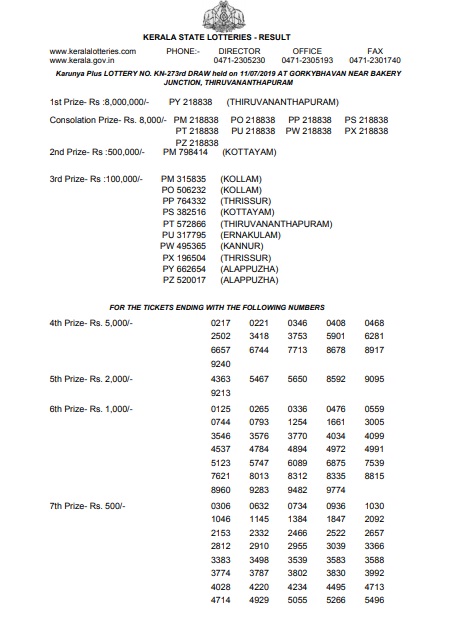 Kerala Lottery Result 11.7.19 Karunya Plus KN 273 Live Today: Lottery Ticket: Karunya Plus Lottery KN 273 rd Draw held on 11/7/19 At Gorky Bhavan Near Bakery Junction Thiruvananthapuram. The first prize is worth Rs 80 lakh, while the second and third are of Rs 5 lakh and Rs 1,00,000 respectively. The consolation prize is Rs 8,000.