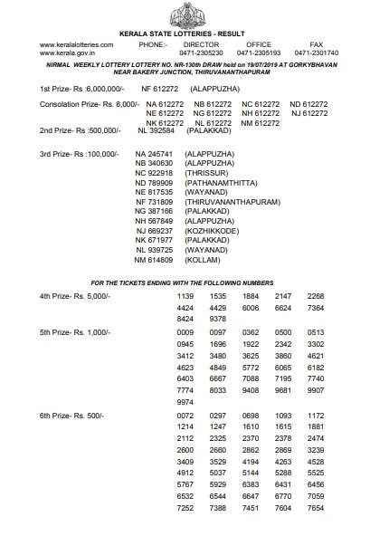 Kerala Lottery Result 19.7.19 Nirmal Weekly NR 130 Today at 3.00 pm : Lottery Ticket : Nirmal Weekly Lottery NR 130 Ticket Draw held on 19/7/19 At Gorky Bhavan Near Bakery Junction Thiruvananthapuram. The first prize is worth Rs 60 lakh, while the second and third are of Rs 5 lakh and Rs 1,00,000 respectively. The consolation prize is Rs 8,000.