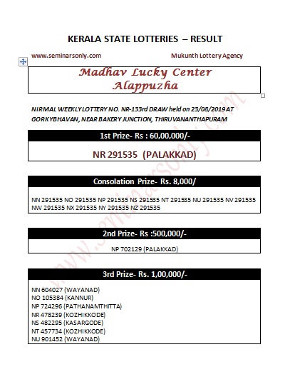 Kerala Lottery Result 23.8.19 (9.8.19) Nirmal Weekly NR 133 Today : Lottery Ticket : Nirmal Weekly Lottery NR 133 Ticket Draw held on 23/8/19 At Gorky Bhavan Near Bakery Junction Thiruvananthapuram. The first prize is worth Rs 60 lakh, while the second and third are of Rs 5 lakh and Rs 1,00,000 respectively. The consolation prize is Rs 8,000.