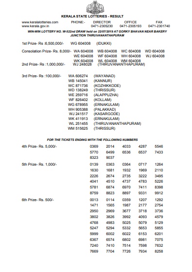 Kerala Lottery Result 22.7.19 WinWin W 522 Live Today : WinWin Lottery W522 Ticket Draw held on 22/7/19 At Gorky Bhavan Near Bakery Junction Thiruvananthapuram. The first prize is for Rs 65 lakh, while the second and third are of Rs 10 lakh and Rs 1,00,000 respectively. The consolation prize is Rs 8,000.